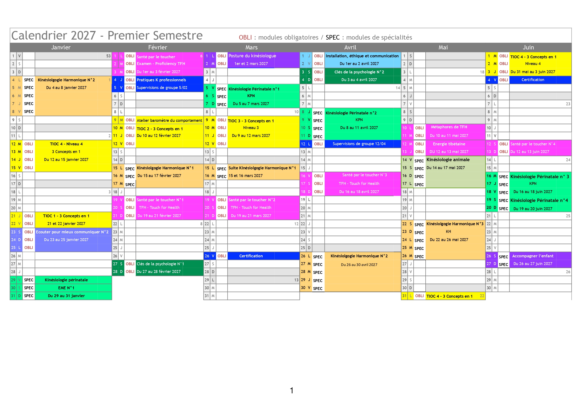 Planning des cours 2026/2027